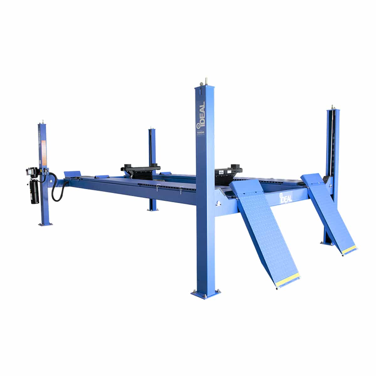 The iDEAL FP14KAC-X 14,000 lb. Four Post Commercial Alignment Lift is a high-performance closed front, cable pull vehicle lift designed for Cars, SUVs, Vans & Trucks. The FP14KAC-X Alignment Lift comes standard with full width Rear Slip Plates, Turntables, Roll-Back Spacers & internal Air-Line Kit, while also applying the latest in design & safety features, such as narrow & wide runway mount positions, extended rise height, concealed hydraulic / mechanical cable lift system with slack cable safety devices and durable pulley & shaft design incorporating convenient grease fittings to extended life of the lift. Easy lift operation is provided with single point pneumatic lock release & high-quality DURO power unit, while providing additional safety & protection with self-chocking ramps and included wheel stops. The iDEAL FP14KAC-X modular design also provides the flexibility to extend the runways for aligning or servicing longer vehicles! The standard powder coat finish, 20” wide runways, adjustable lock stops for easy runway leveling and optional power unit mount positions complete the package for a premium, high quality alignment lift, all at an unmatched value!