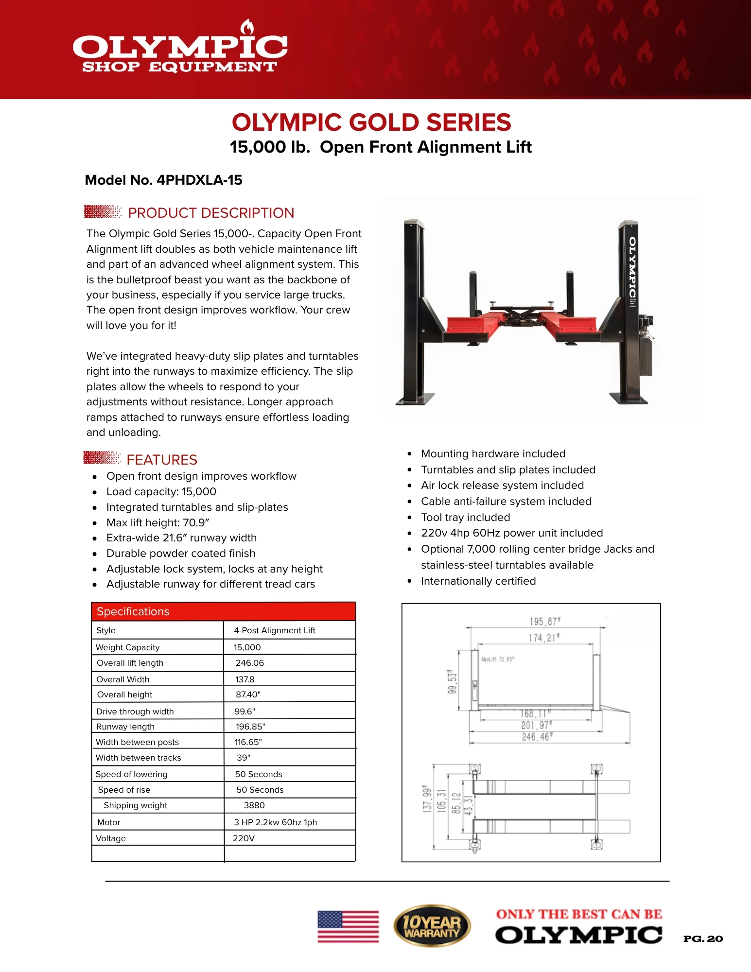 When it comes to power, performance, and precision, Olympic lifts lead the industry. Each lift is engineered with premium materials, tested to 150% of its rated capacity, and backed by an industry-best 10-year warranty. Olympic delivers lasting value, unbeatable safety, and the quality your business deserves.