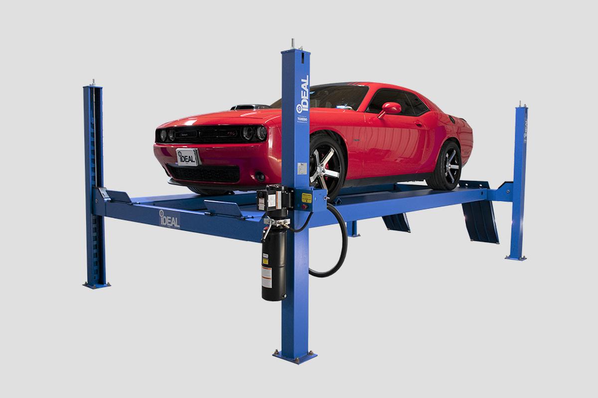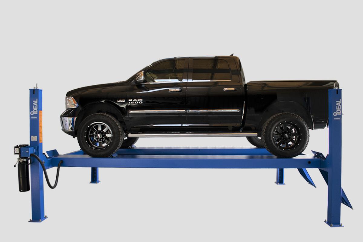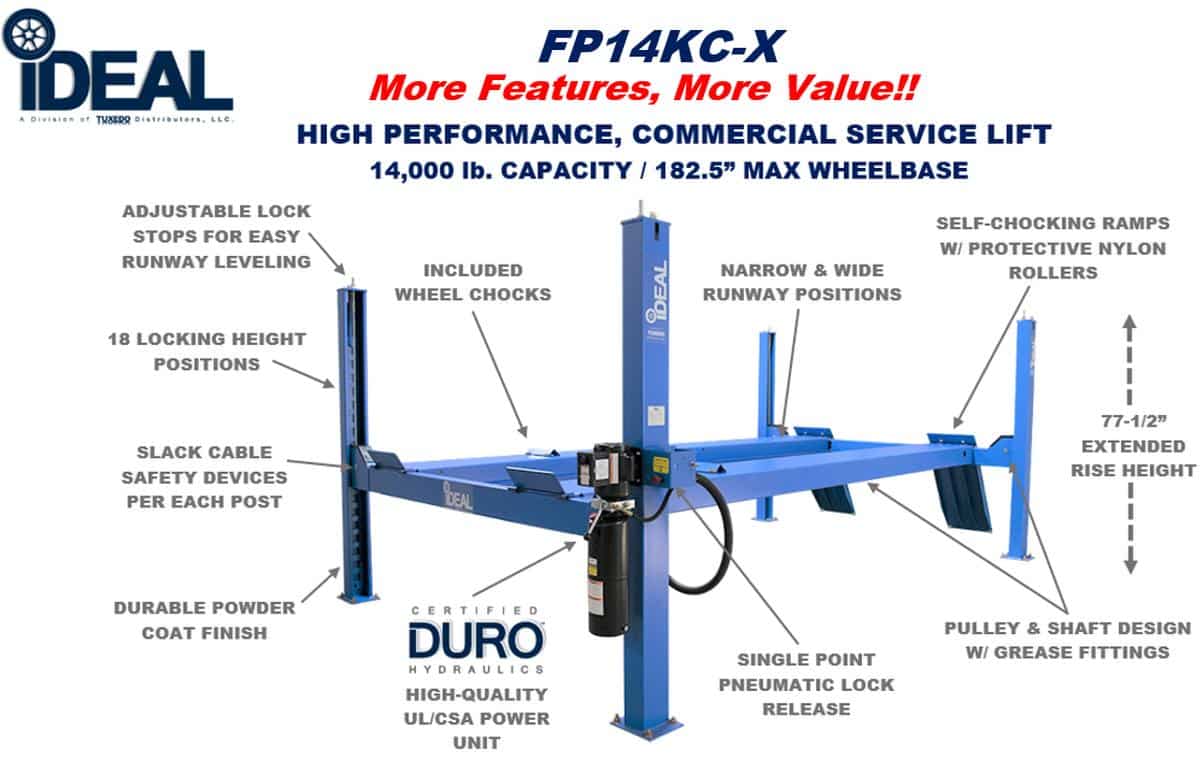 The iDEAL FP14KC-X 14,000 lb. Four Post Commercial Service Lift is a high-performance closed front, cable pull vehicle lift designed for Cars, SUVs, Vans & Trucks. The FP14KC-X Service Lift includes the latest in design & safety features including, narrow & wide runway mount positions, extended rise height for greater undercarriage vehicle access, concealed hydraulic / mechanical cable lift system with slack cable safety devices and durable pulley & shaft design incorporating convenient grease fittings to extended life of the lift. Easy lift operation is provided with single point pneumatic lock release & high quality DURO power unit, while providing additional safety & protection with self-chocking ramps and included wheel stops. The iDEAL FP14KC-X modular design provides the flexibility to extend the runways for servicing longer vehicles, while also providing the ability to convert into a high-quality Alignment Lift quickly & easily! The standard provided powder coat finish, 20” wide runways, adjustable lock stops for easy runway leveling and optional power unit mount positions complete the package for a premium, high quality service lift, all at an unmatched value!