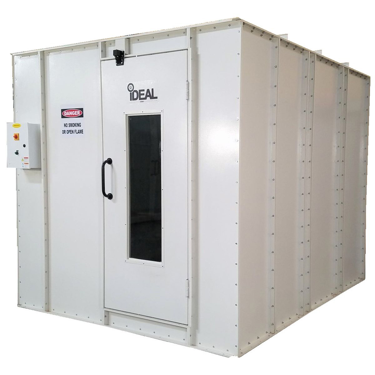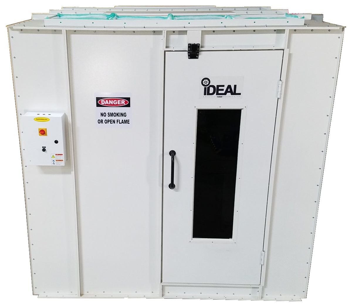 The iDEAL Paint Mixing Room is designed to provide superior lighting with a clean & controlled ventilated work area for safe paint mixing applications. Air flows through the ceiling intake filters towards one end of the room and downward into the filtered exhaust plenum and is discharged upwards through exhaust fan & ducting. This unique design allows for differ installation configurations, as the personnel door can be placed in either the front or side of the mixing room. The fan & plenum chamber are purposely located outside of mixing room to provide lower decibel levels while working inside. The included bright white powder-coat finish, deluxe control panel, premium filters & high-quality tube-axial exhaust fan complete the package for a premium, high quality Paint Mixing Room, all at a great value!